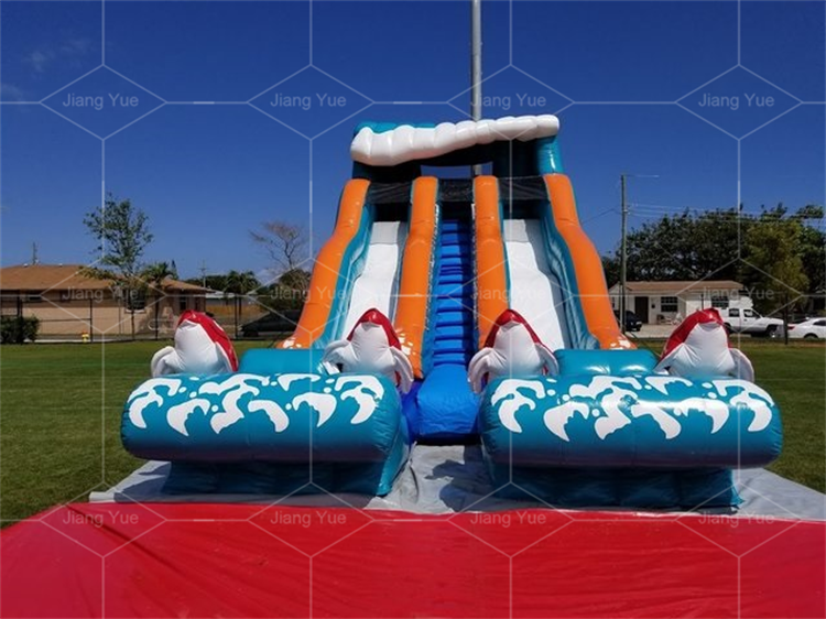 The Big Kahuna water slide is perfect for little beach combers and surfers at your festival or party. A great way to cool off, this exciting ride allows participants to climb 17 feet to a No-Jump Top, which forces riders to slide down correctly, keeping them secure. A midway hump will have riders saying "Cowabunga!" into the safety-ended pool at the bottom of this impressive slide. A beachy, blue and orange ocean theme completes the Big Kahuna look, with a pair of orange fish waiting at the bottom of the slick and cool slide.