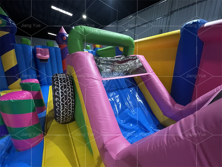 3). The entrance is safe for playing and easy to open and close. The outlet with two zippers is use for faster deflating and the Velcro is use for protecting the zipper. Each toy has two pipes for inflating.