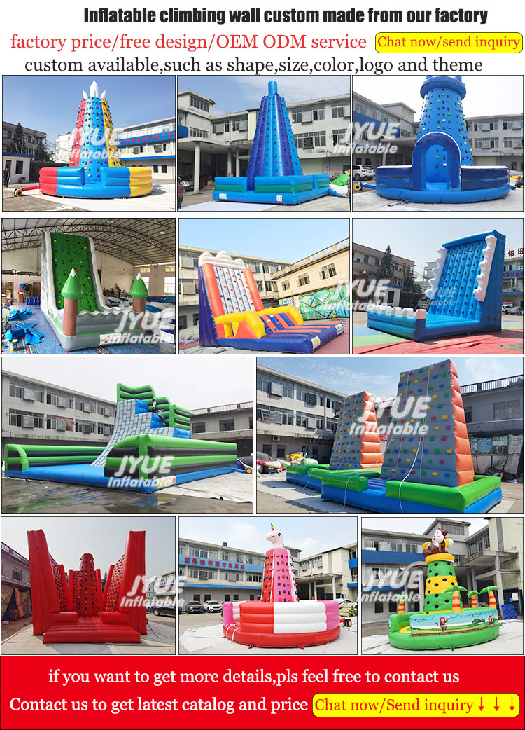 Inflatable climbing wall is a large blow-up structure for both adults and children to climb. Inflatable rock wall mainly consists of 2 parts, one is the inflatable vertical climb wall with holds and grips, another is the bounce house bottom. The inflatable wall is fun and safe for kids and adults to try the climbing game in any outdoor party and event.