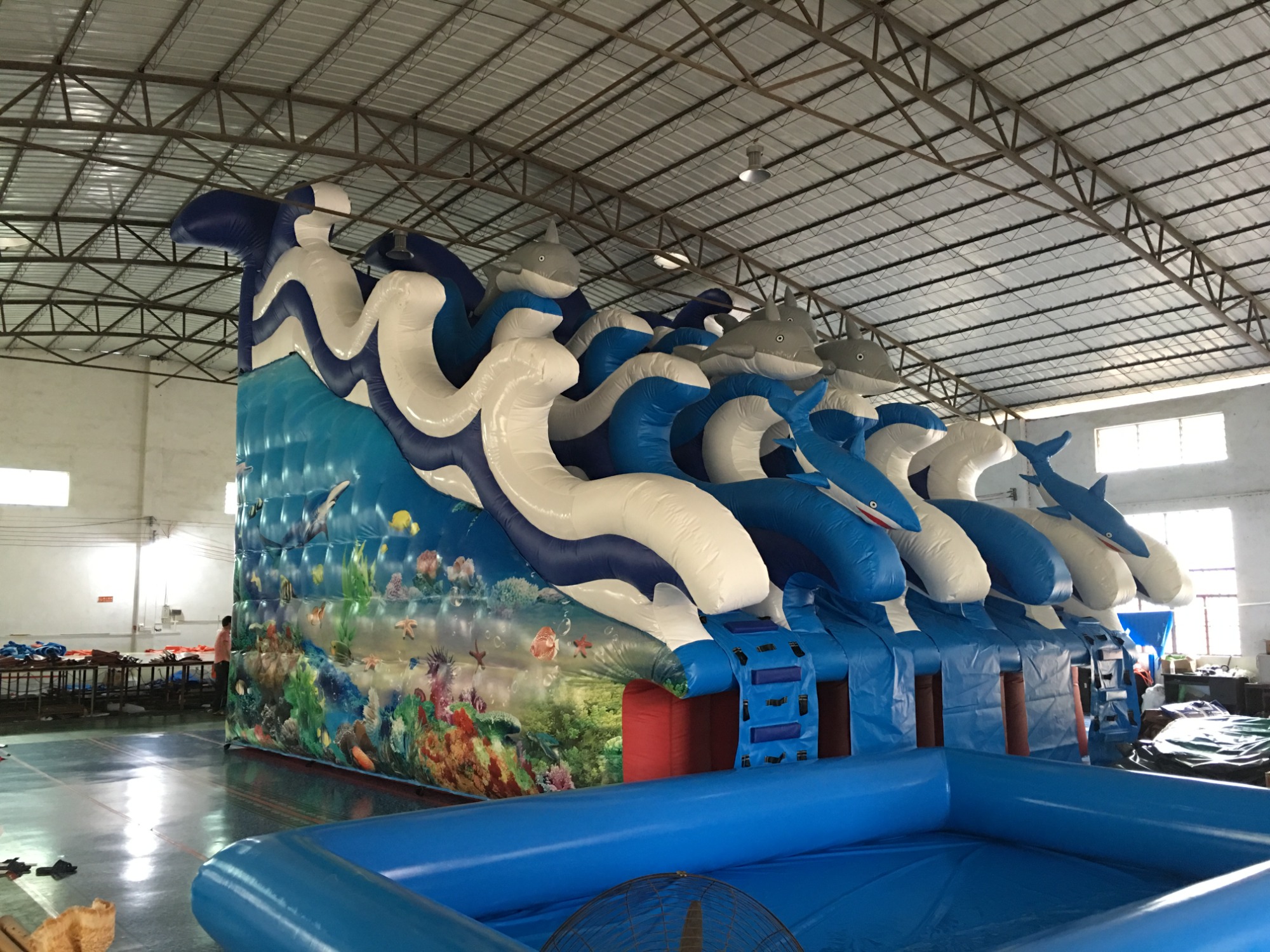 This dolphin pool inflatable slides we made is for commercial , and it can be extensively placed in outdoor occasion like parks, gardens or backyards, schools or some other playing centers etc; Children will enjoy themselves in this wonderful water paradise.