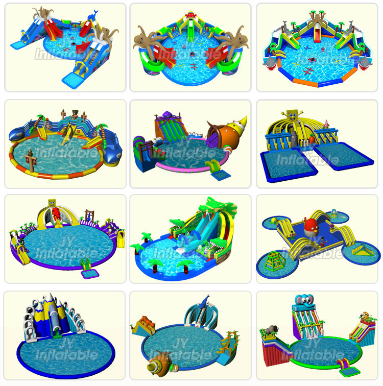 huge inflatable water park is a new combined inflatable game which is usually combined with inflatable slide and water pool. People can climb into the water pool by ladder to have fun in water; also you can climb to the slides by the separated air bag and steps then you can slide all the way down with water, very fun and exciting! Inflatable aquatic park suits for both of adults and children, adults can swim in the big water pool and children can play the equipped water games in pool like water ball, water boat, bumper boat, water totter, water roller and so on. Inflatable water world is very popular during summer for all people who like water sports leisure; it is the hottest inflatable product for you to make profit in summer.
