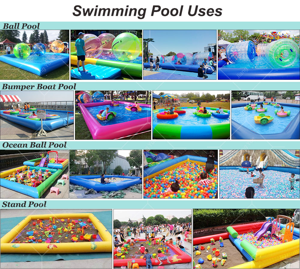 Pool Inflatables For Adults can be used together with water walking ball, paddler boat, inflatable bumper boat, roller ball, floating iceberg, water trampoline and other water sports games as water pool for kids to get great fun indoor or outdoor. All the inflatable pools we make are welded by hot air machine(not glued).There are many sizes for you to choose, usually from 24 m2 to 400 m2. Anyway, we make the size according to your requirements.An inflatable water pool offers something for kids of all ages.