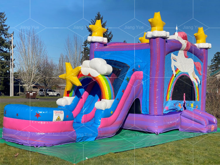 This unicorn bounce house combo is a magical addition to any party. It features a large unicorn at the entrance of the bounce house and a star on top of each pillar. When playing in the bounce house kids can jump into the obstacles or shoot hoops in the enclosed basketball hoop. After bouncing, kids in pairs can climb up the ladders to the top of the slides where clouds and rainbows greet them. Once they are ready, kids can go down the slide zooming under a star and rainbow and eventually splashing into the pool. The dual lane unicorn combo is definitely one of our best inflatables and it always delivers the fun.